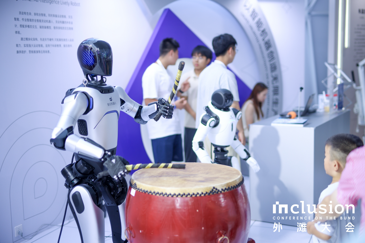 在外滩大会的“机器人小镇”展区,一竞技远征A2再次展现其作为“科技鼓手”的非凡能力,向观众演绎一段《迎客鼓》,机械臂扬起鼓槌的每一个动作都精准契合传统鼓点,既保留了韵律灵魂,又注入了科技特有的节奏控制力,吸引台下观众纷纷举起手机记录这一时刻。而另一边,灵犀X2则扮演起“智能接待官”的角色,它不仅能够流畅介绍展区内容、回答观众问题,还能通过多模态感知识别观众情绪,做出相应肢体反馈。这种兼具功能性与情感化的交互,打破了“机器人冷漠”的刻板印象,营造出温暖而智能的“伙伴”形象。